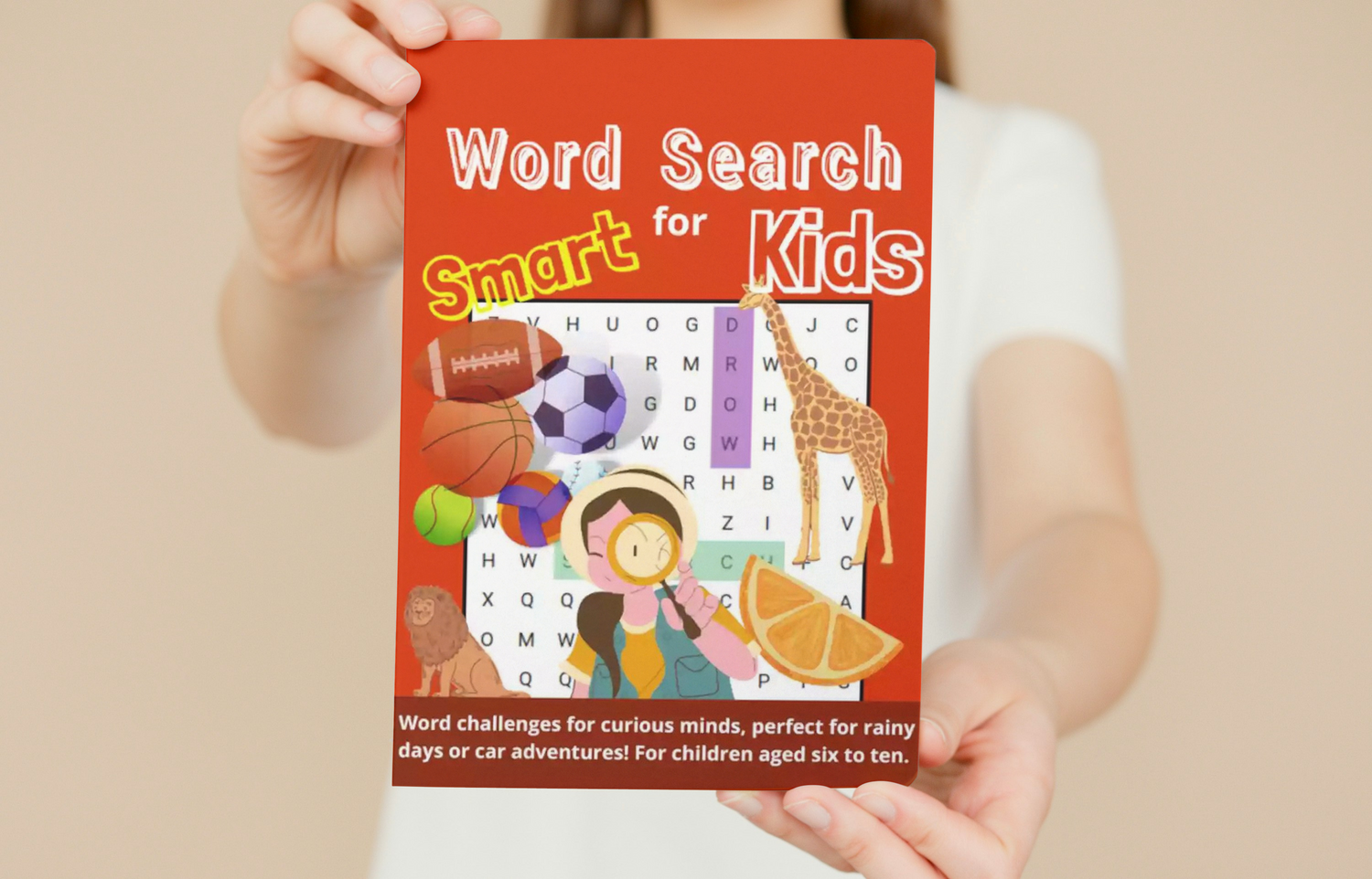 “Word Search For Smart Kids” – Caça palavras em inglês para crianças de seis a dez anos - à venda na Amazon americana; e